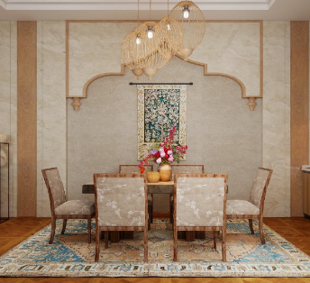 In the restaurant, the unique arched wall design complements the ethnic-themed paintings and decorations, paired with patterned carpets and distinctive woven pendant lights to create a warm and comfortable dining space.