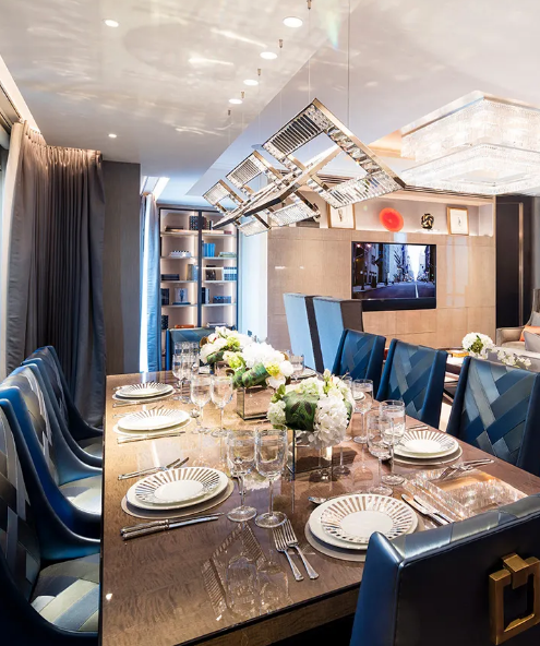 Using a multi-layered lighting system combining pendant lights and recessed ceiling lights, it becomes a visual focal point, creating a warm and cozy atmosphere for the dining area, presenting a refined and upscale quality to the space.